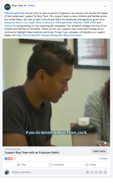 Boys Town’s Matching Monday initiative is a standout example of how intelligent storytelling and strategic recognition can supercharge donor engagement. The concept is simple but powerful: each Monday, Boys Town publicly highlights companies that have supported the organization through matching gifts, thanking them across social media platforms and showcasing the collective impact of corporate generosity.
